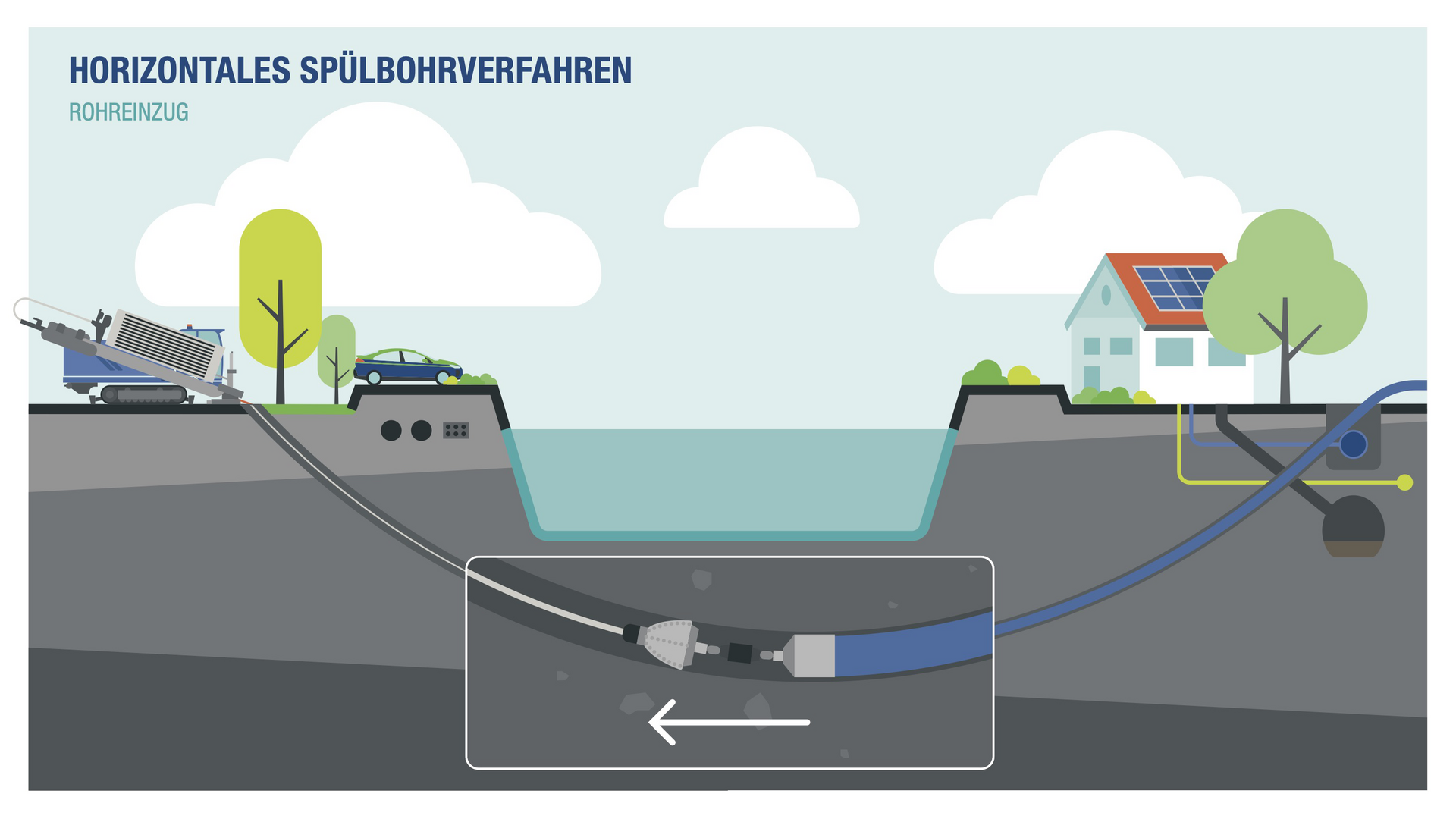 Mit dem Spülbohrverfahren lassen sich Rohrleitungen innovativ unterirdisch in den Boden einziehen. Dabei wird vorab eine gesteuerte Pilotbohrung bodenverdrängend oder austragend durchgeführt. Bedeutet: Der Bohrkopf, der die Pilotbohrung herstellt, ist mit asymmetrischen Schneidelementen und Hochdruckdüsen ausgestattet. Mithilfe eines drehbaren Steuer-/Bohrkopf kann der Boden mechanisch und hydraulisch abgebaut bzw. verdrängt werden. Die Steuerung erfolgt über die Schrägstellfläche des Bohrkopfes. Ein Sender ermöglicht die permanente Ortung des Steuer-/Bohrkopfes, um den Baufortschritt jederzeit ermitteln zu können.